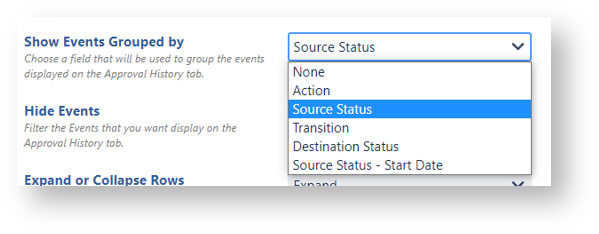 The Show Events Grouped by option allows you to choose a field that will be used to group the data displayed on the Approval History tab.