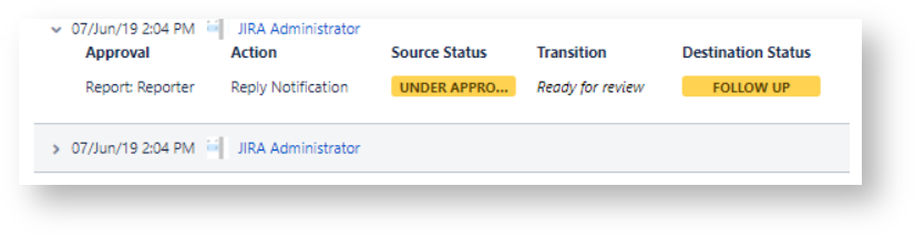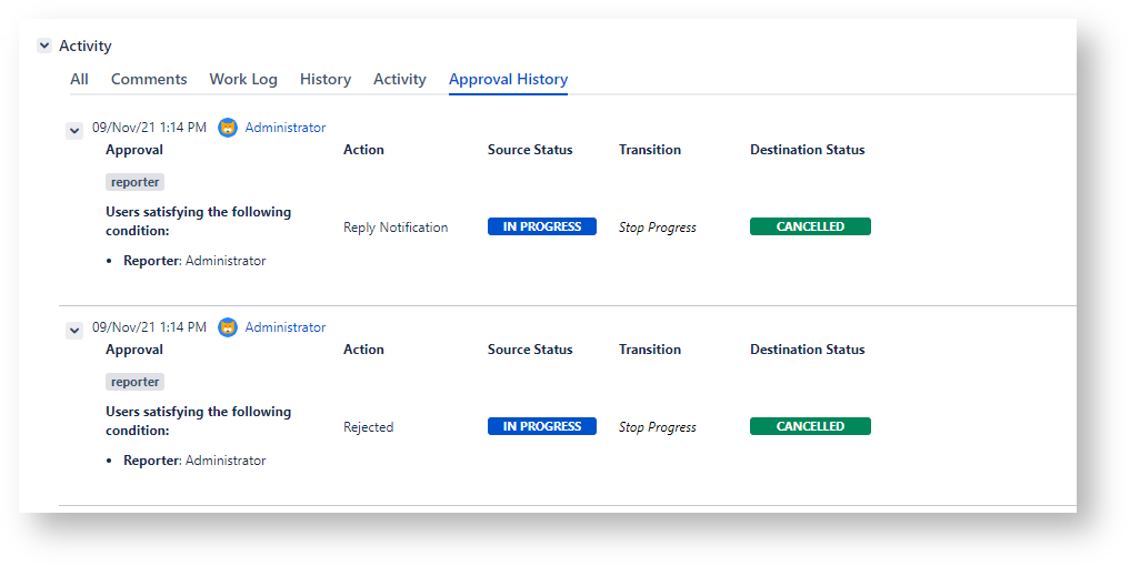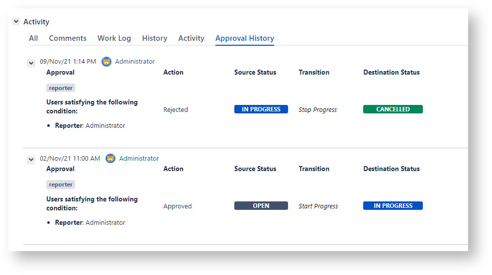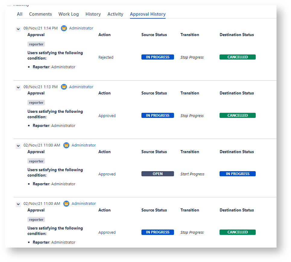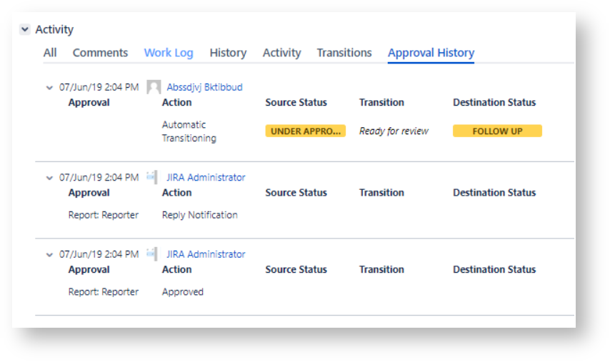 - enable the Approval History tab on the issue in order to display historical data relating the Approvals for the current issue