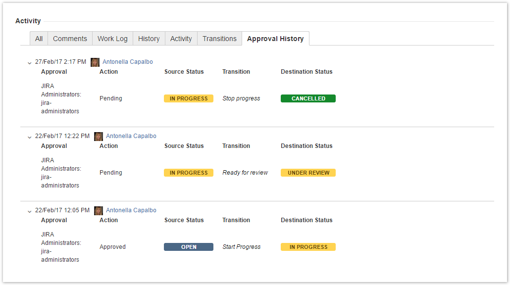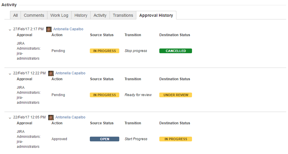 The information displayed on the Approval History tab and its aspect can differ depending by the setting applied by the Jira System Administrators.