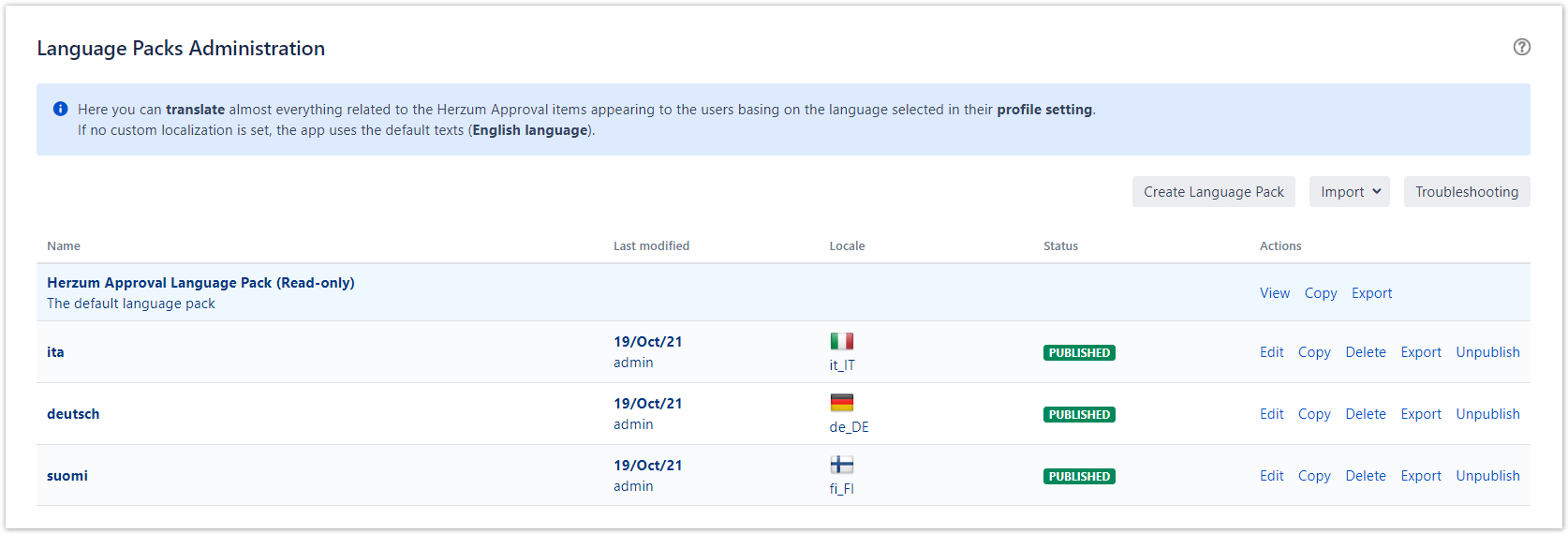 As a Jira administrator, you can manage Language packs in order to translate almost everything related to the Herzum Approval items appearing to the users basing on the language selected in their profile setting.