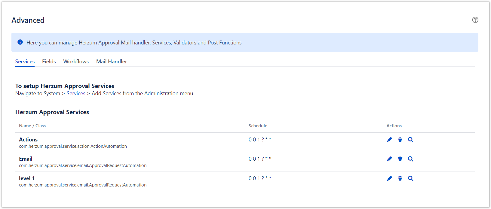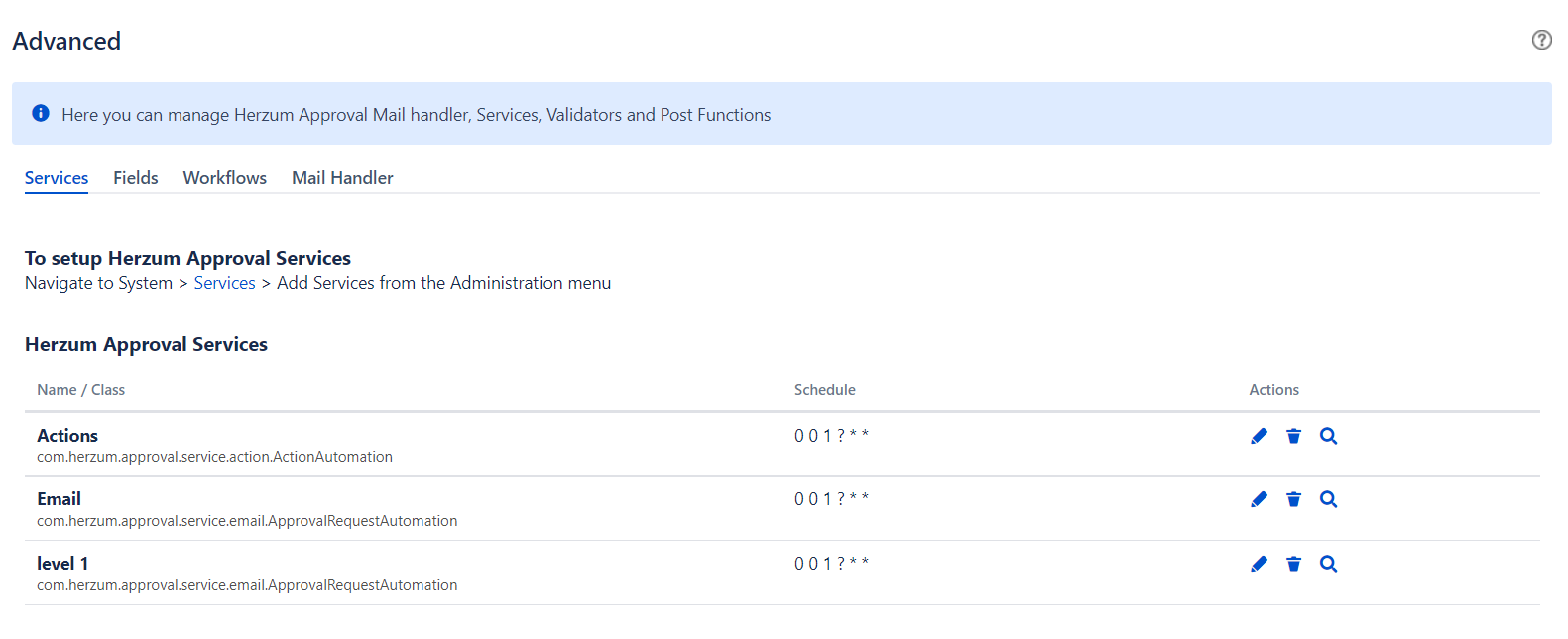The Advanced screen allows you to manage Herzum Approval Mail handler, Services, Validators and Post Functions.