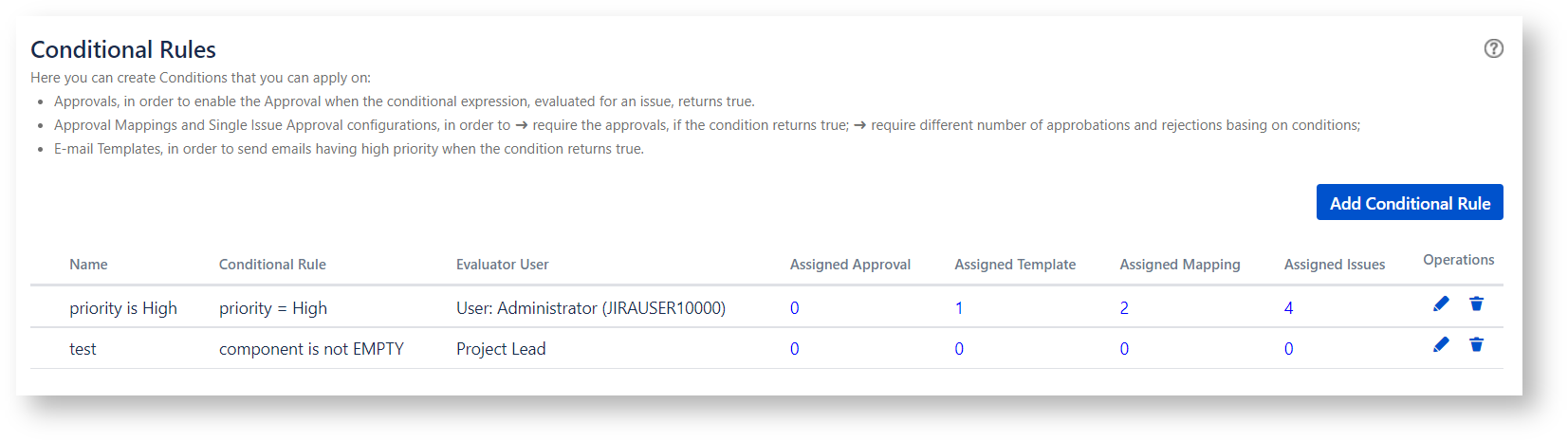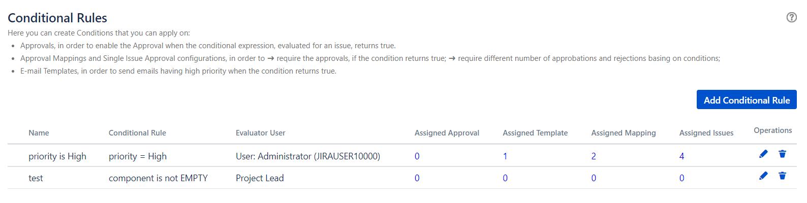 The Conditional rules are Jql expressions that can be used to to meet complex requirements (e.g eable/disable Approvals, Minimum Required Rejections, etc).