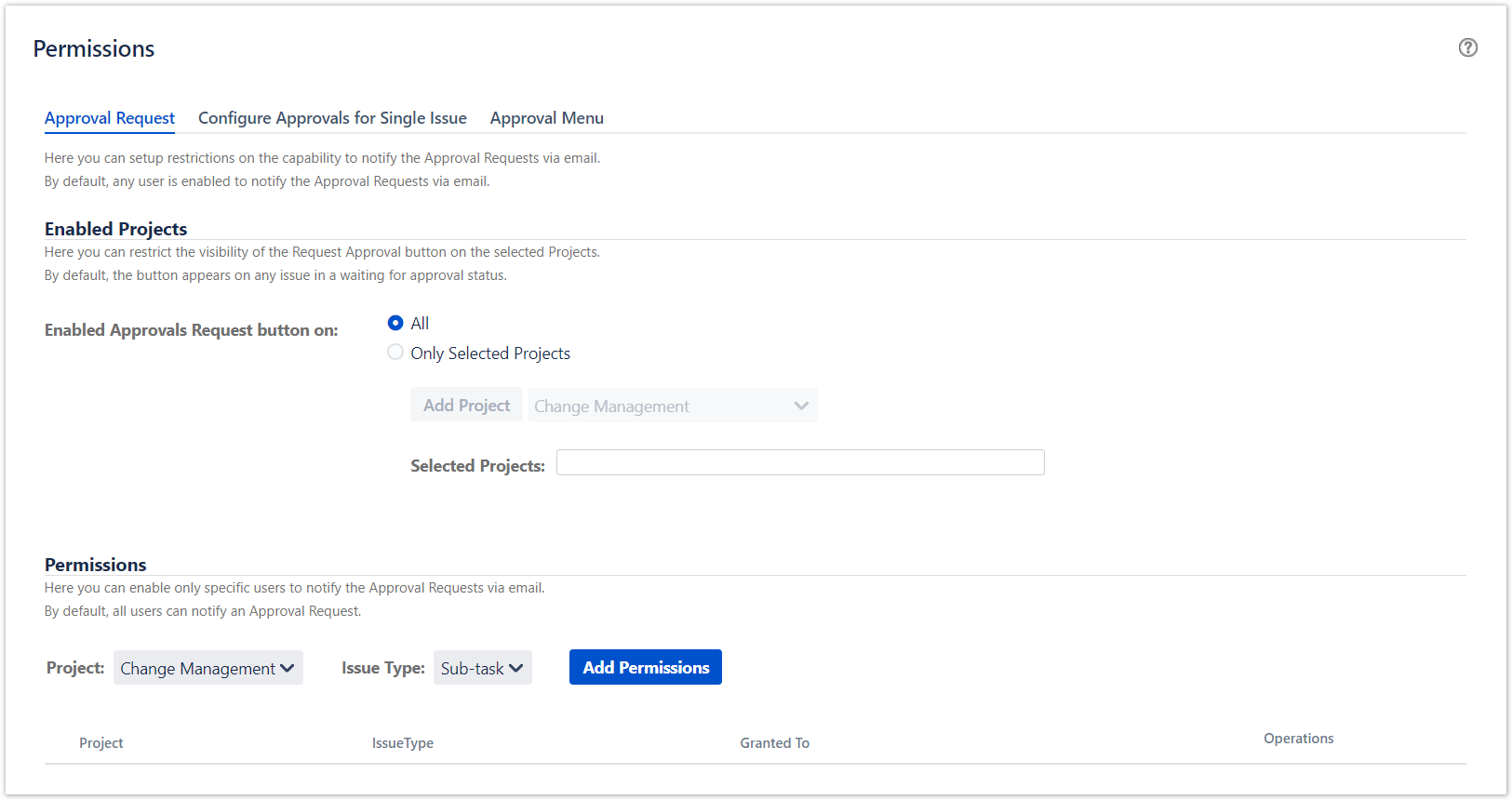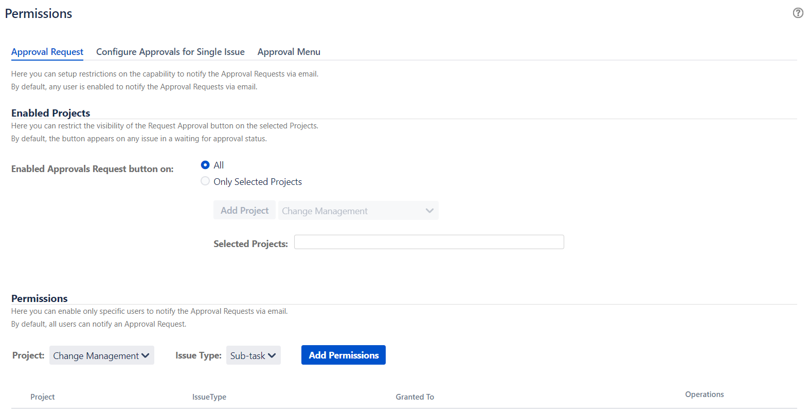 The Permissions screen allows you to grant o deny the permissions to Notify the Approval Requests, Configure Approval Flow for single issues, Dispaly the Approval Menu.