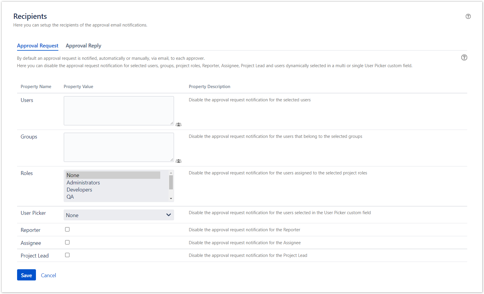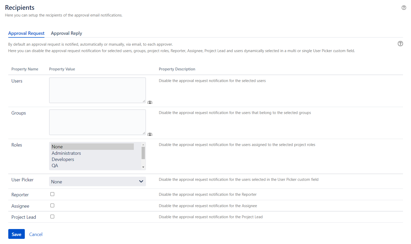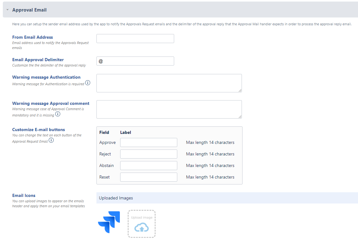 - Approval Requests and Replies by Comment → Enable notifying the approval request via a Jira comment and processing the approver response from a Jira comment (Disabled by default).
