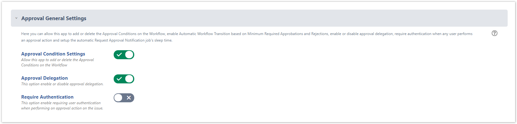 - Approval Condition Settings → enable/disable the automatic the automatic addition and deletion of the Approval Conditions on the workflows (Enabled by default).