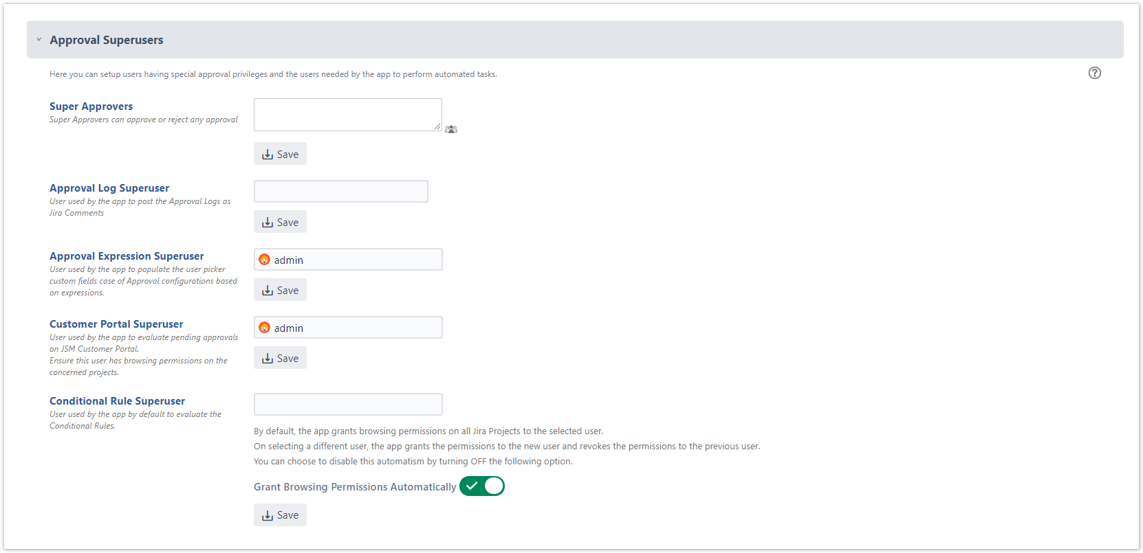 - Approval Expression Superuser → User used by the app to populate the user picker custom fields case of Approval configurations based on expressions (Not set by default). It's mandatory to select an user in order to create Approval configurations based on expressions.