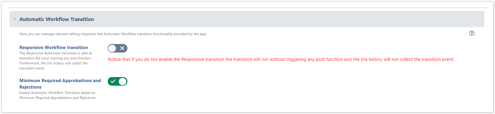Responsive Workflow transition → Enable the Responsive Automatic transition in order to allow the app to transition the issue by running post functions and make the Jira history. consistent with the transition event (Disabled by default). It's recommended to enable it and select the Automatic Workflow Transition Superuser that will be used by the app to run the automatic workflow transition.