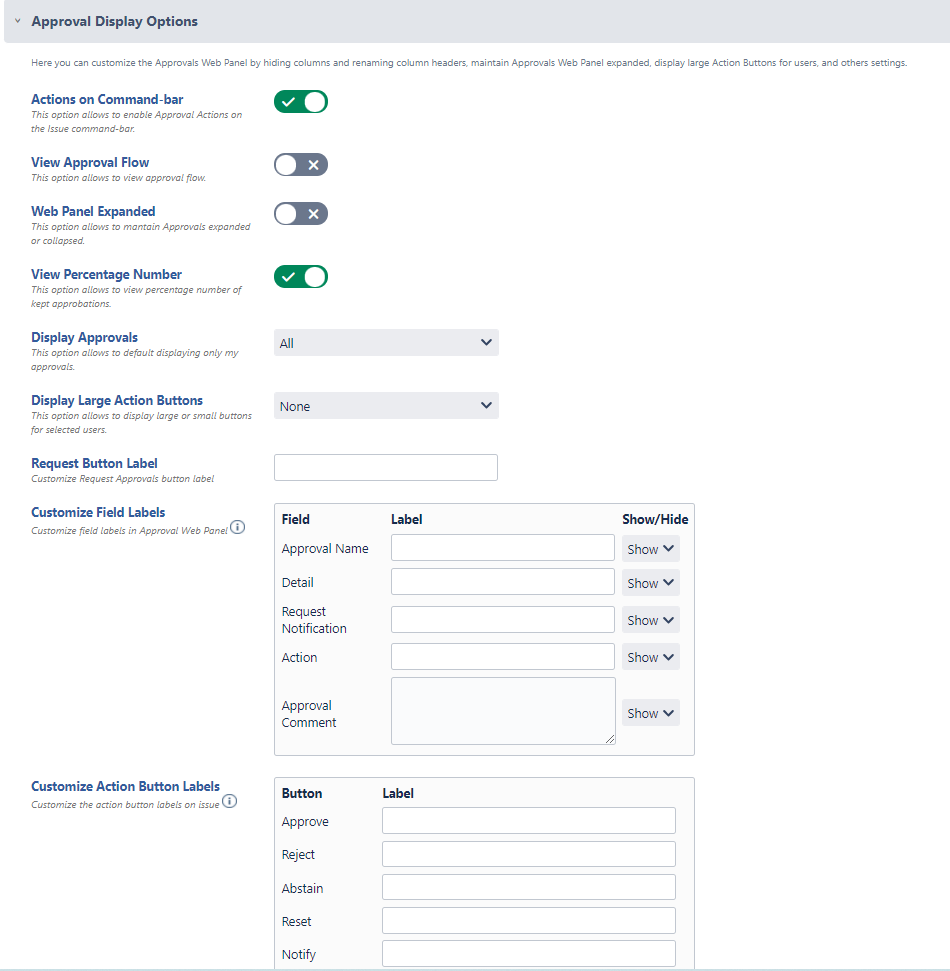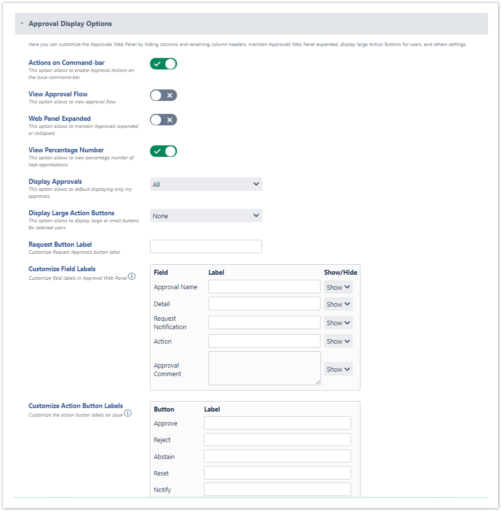 Actions on Command-bar → This option allows to enable Approval Actions on the Issue command-bar (Disabled by default).