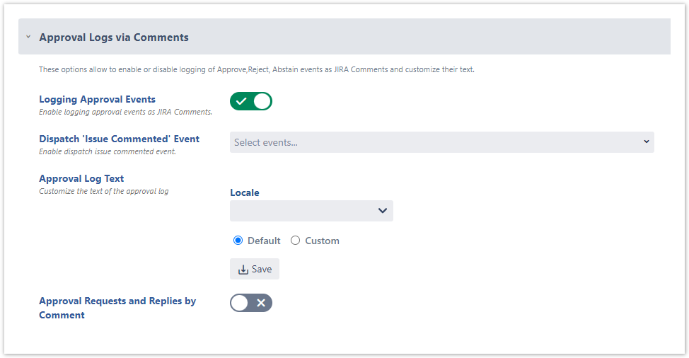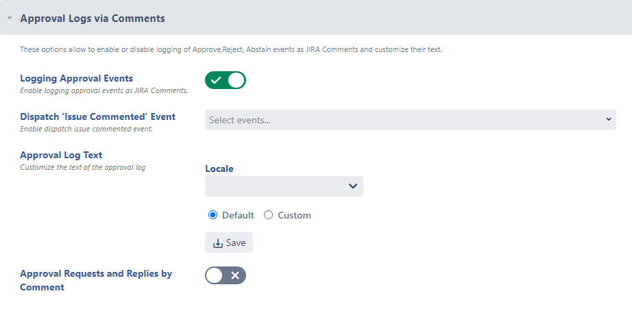 Approval Log Text → Customize the text of the approval log (No Locale and No Custom Log Text by default). If no Locale and no Custom Log Text is set, the default log text is added to Jira comments.