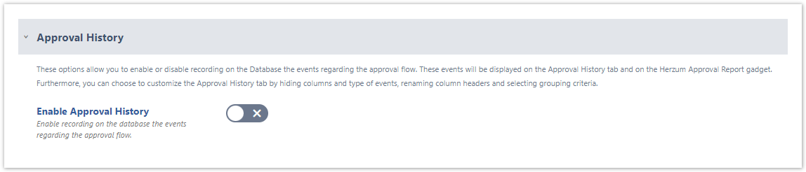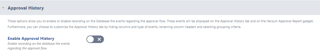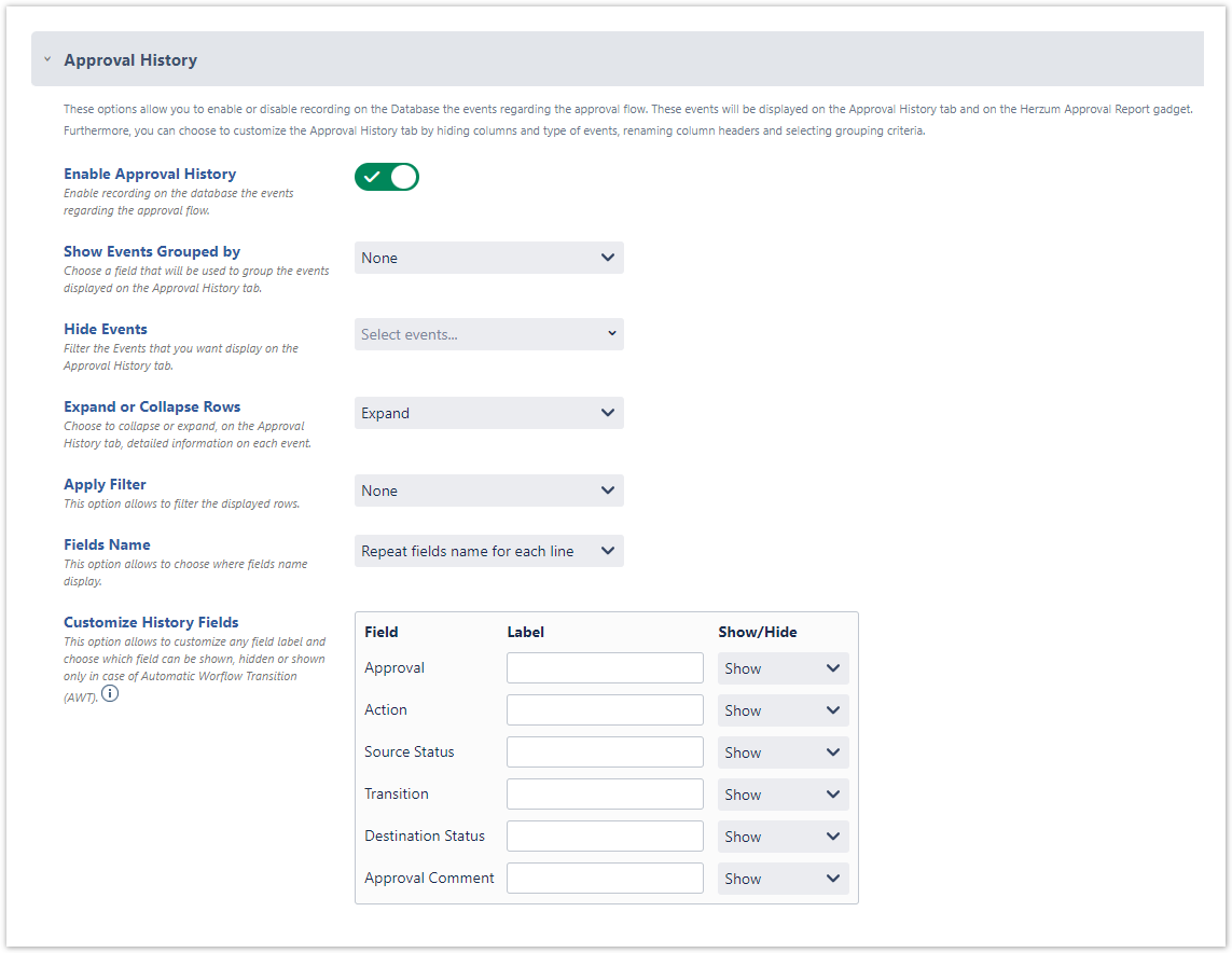 - Enable Approval History → Enable recording on the database the events regarding the approval flow (Disabled by default). It's recommended to enable Approval History. It allows to display approval events on the Approval History tab on the issue and on the Herzum Approval Gadget that can be displayed on Jira Dashboards.