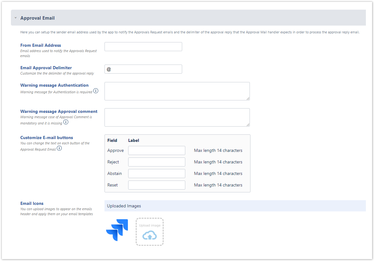Warning message Approval comment → Warning message appearing on emails notifying that the Approval Comment is mandatory and it is missing (No custom Warning message text for missing Approval comment by default). If it is not set, the default Warning message text is used.