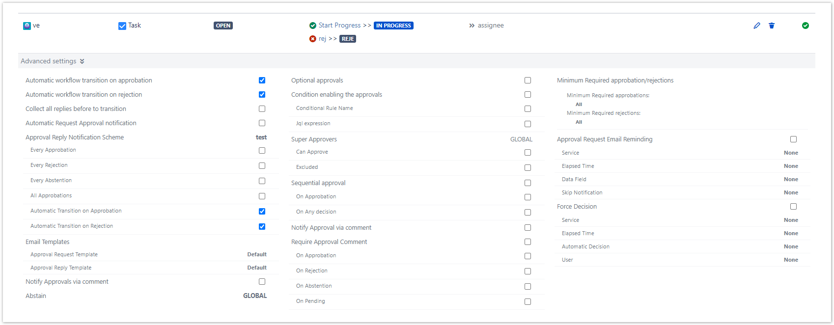 - Minimum Required Approbations and Rejections → Enable Automatic Workflow Transition based on Minimum Required Approbations and Rejections (Disabled by default).