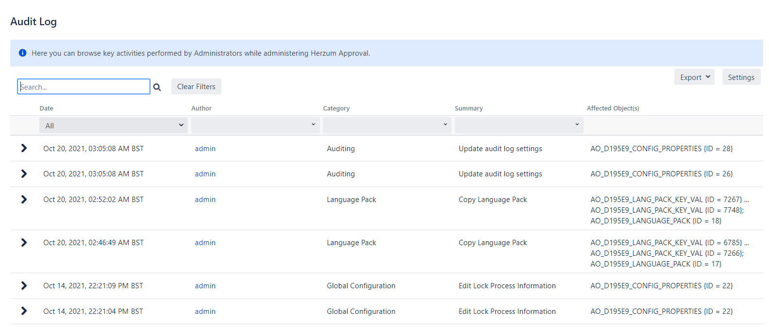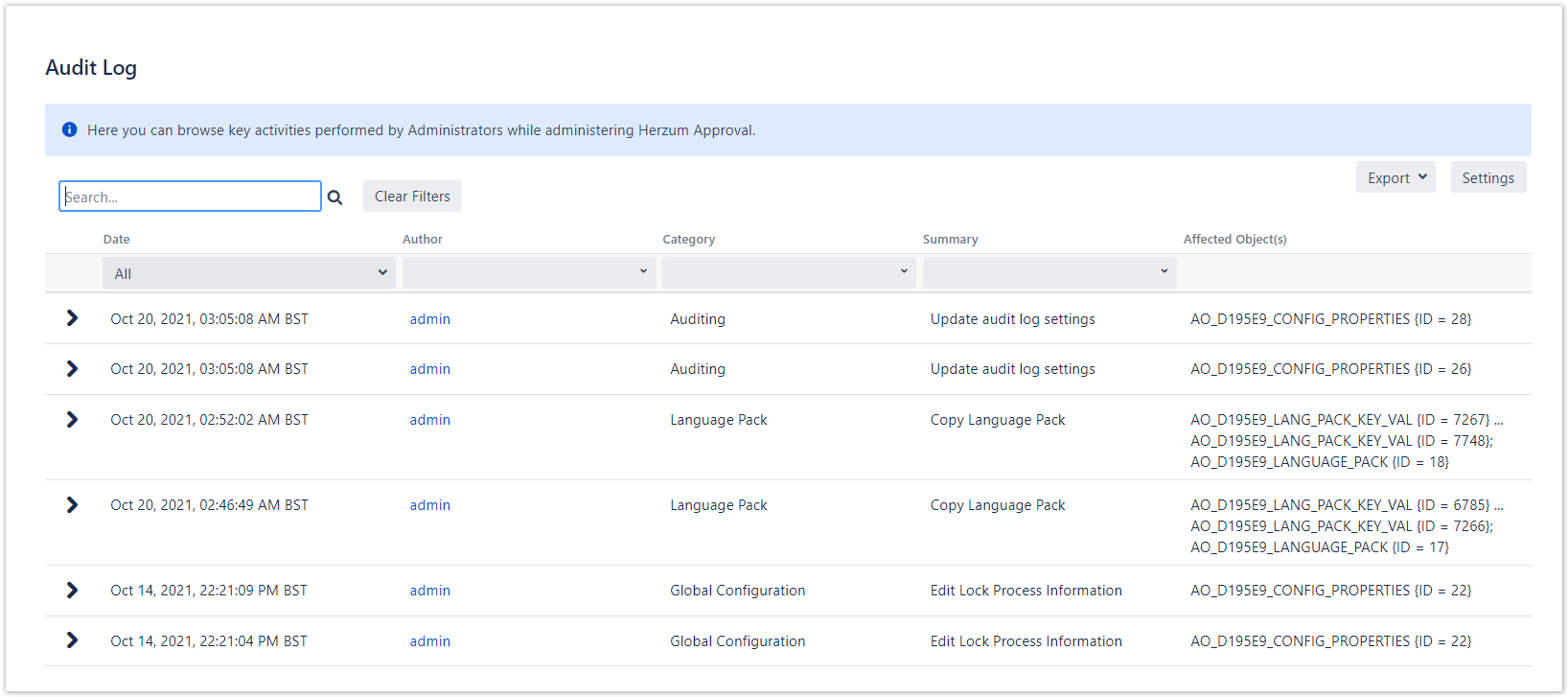 The Audit Log administration screen allows you to monitor the administrative activities performed by any Jira Administrator on the Herzum Approval administration screens.