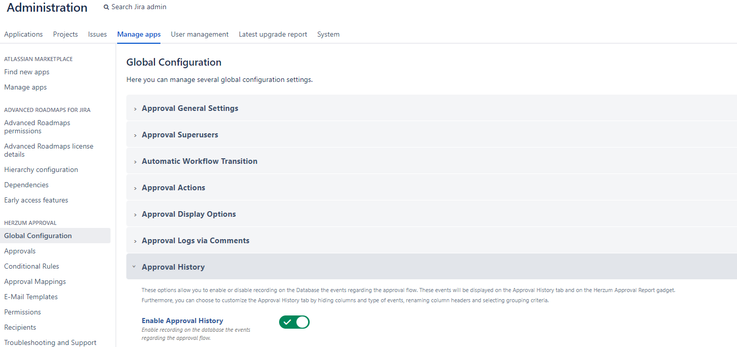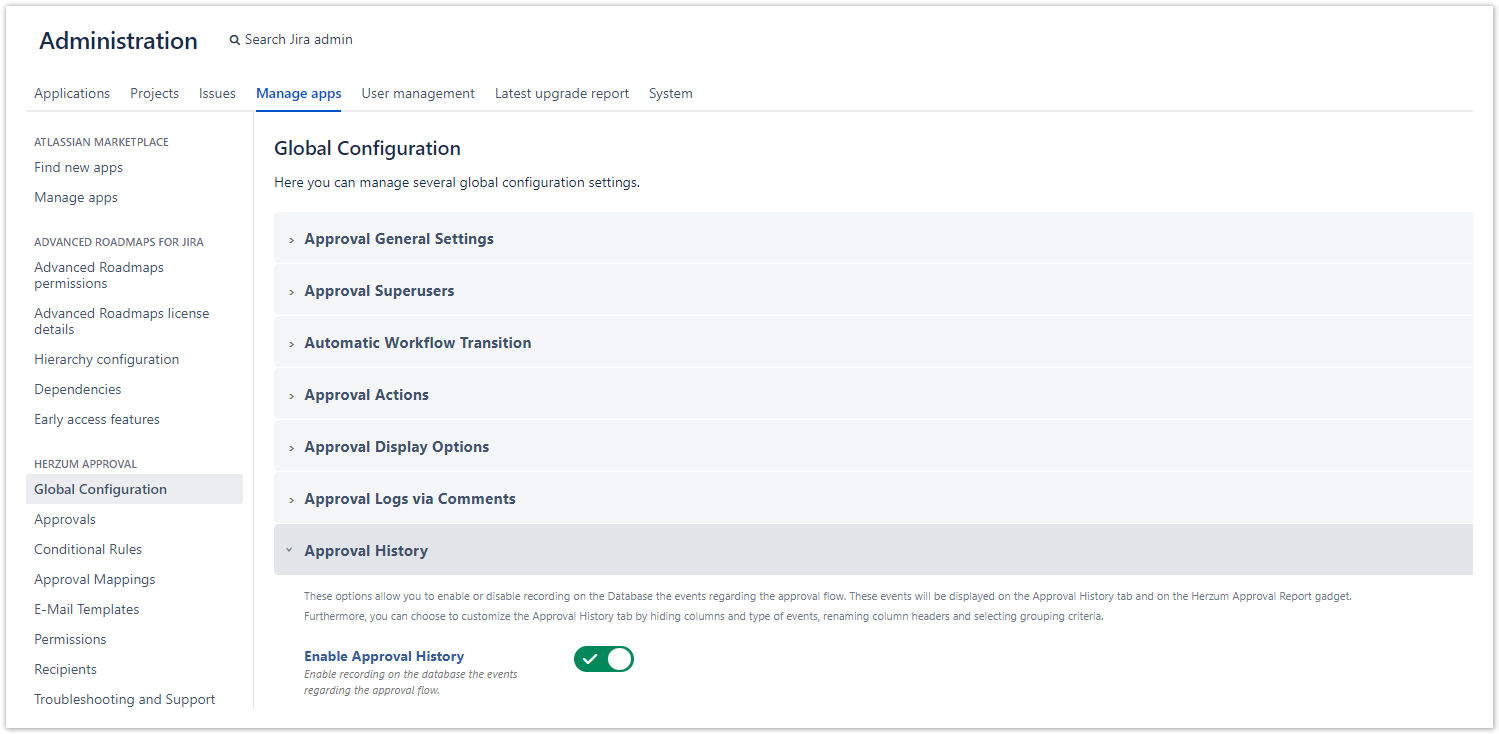 Manage apps → Global Configuration → Approval History → Enable Approval History