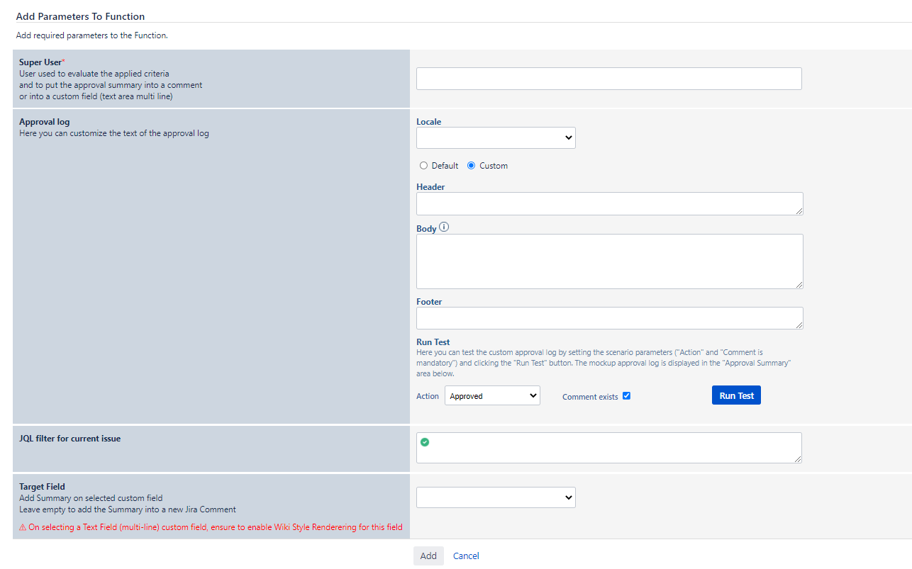 - Target Field - Add Summary on the selected custom field (Optional): When filled, the Approval Summary will be put on the selected custom field. Leave empty to add the Summary into a new Jira Comment on the current Issue.