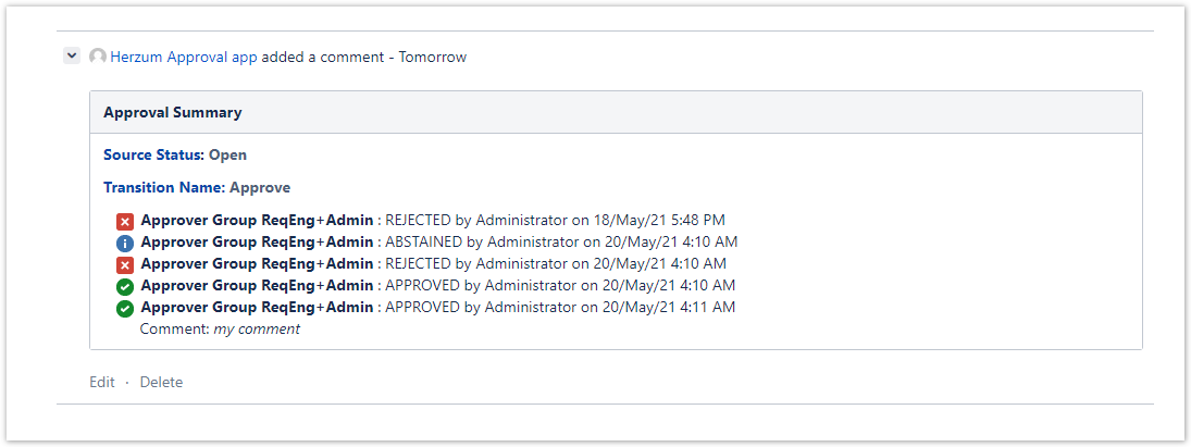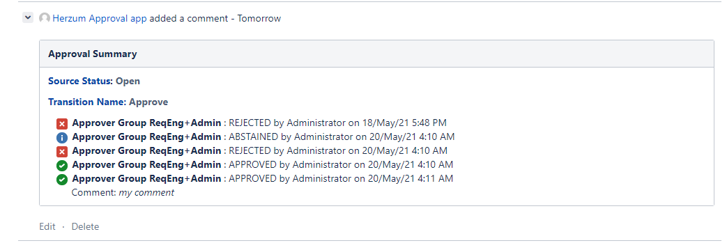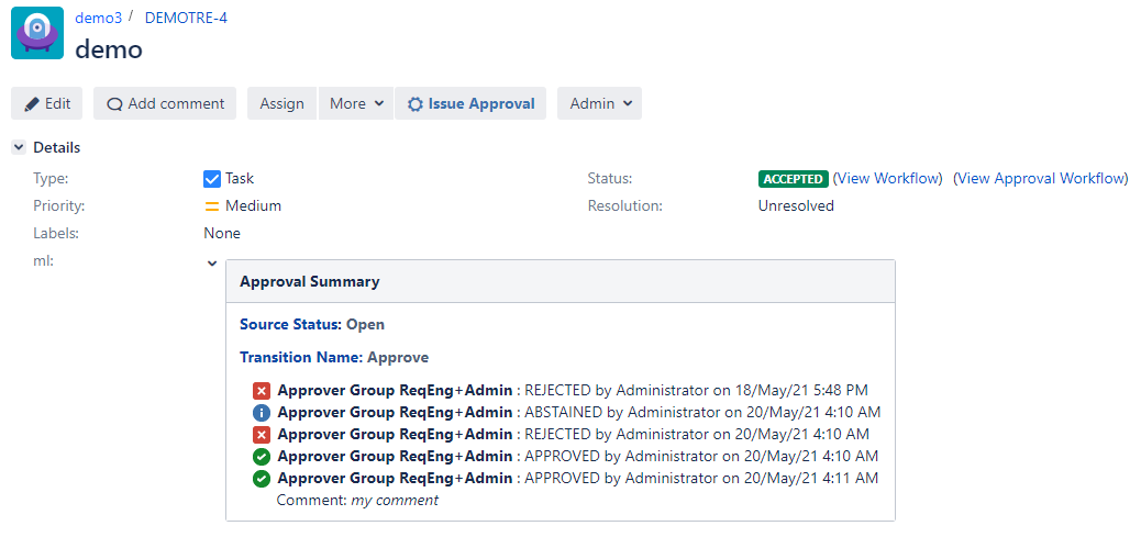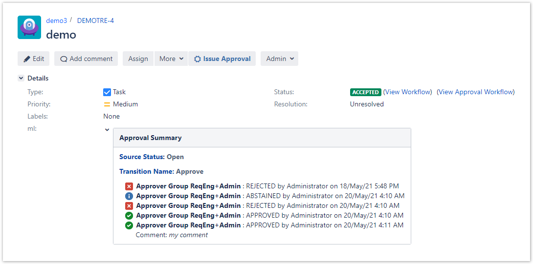 The Approval Summary is filled with the latest approval decision for each mapping applied on the issue identified by its Source status and transition on approbation.