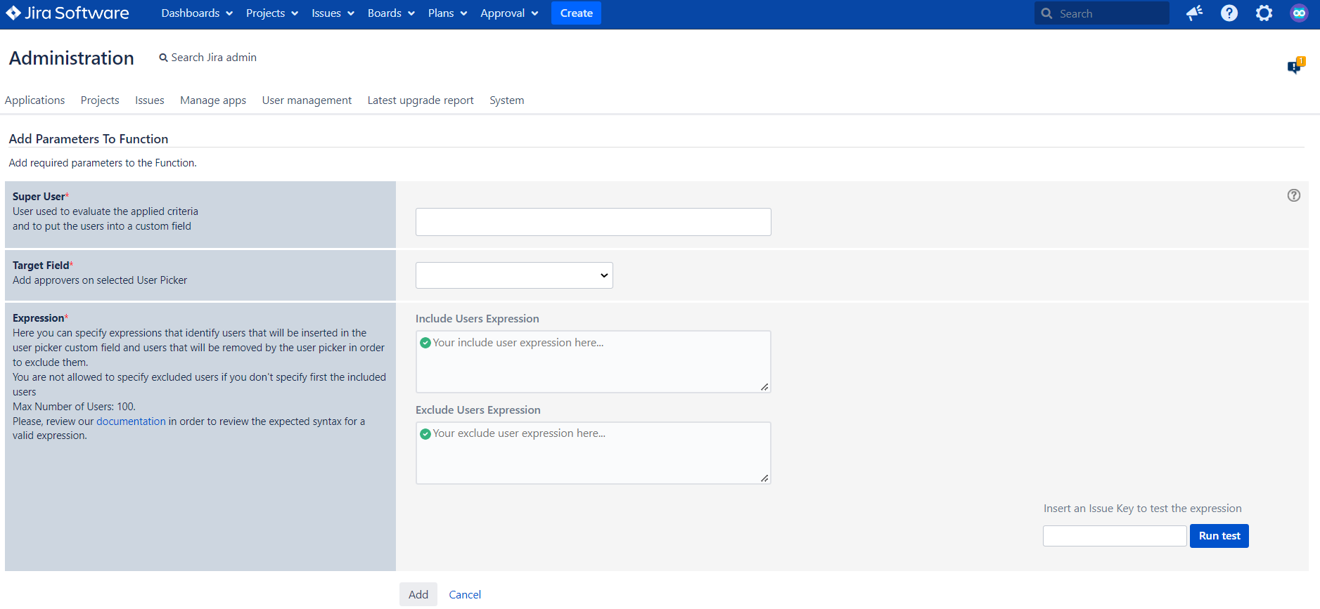 3. Expression (Required) - expressions that identify users that will be inserted in the user picker custom field and users that will be removed by the user picker in order to exclude them.