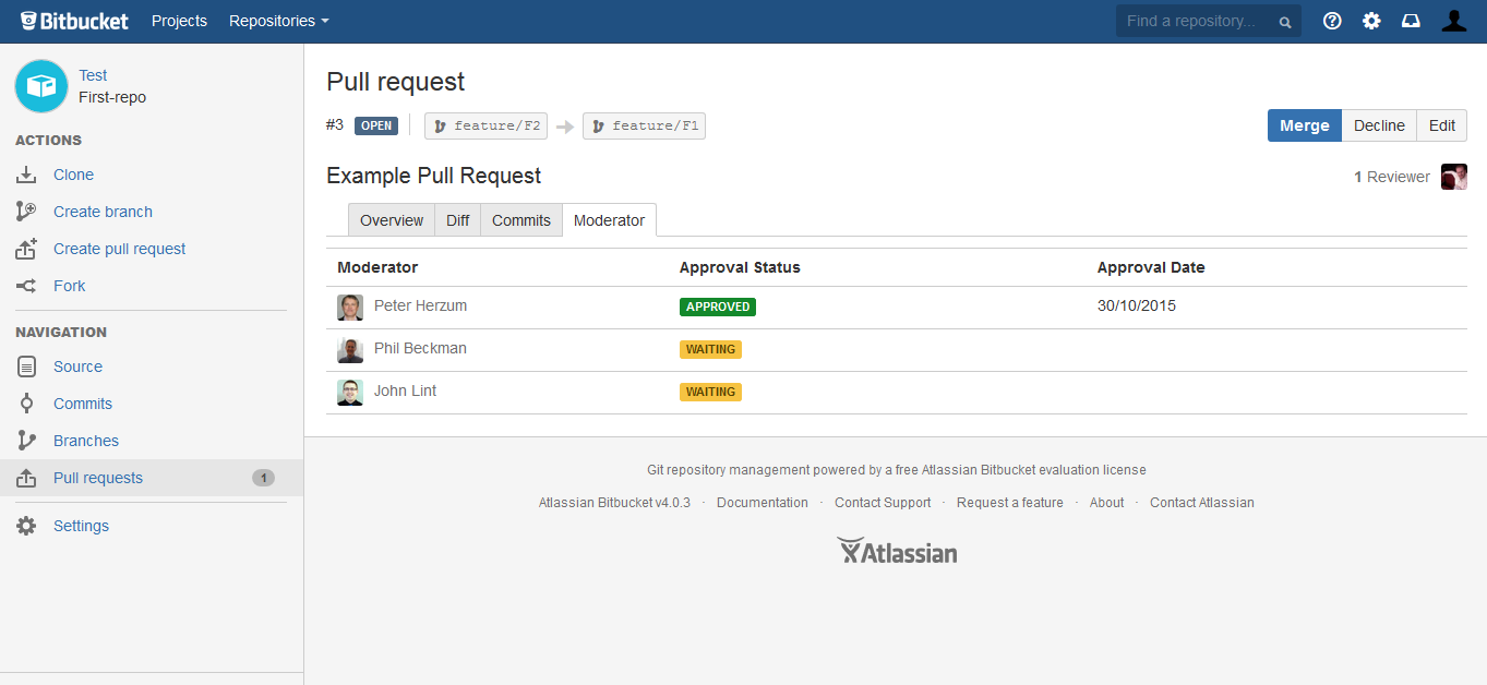 As a user, if you open a pull-request you can see the approval status by opening the Moderator tab. This tab shows all the moderator/s defined per repository or project basis.
