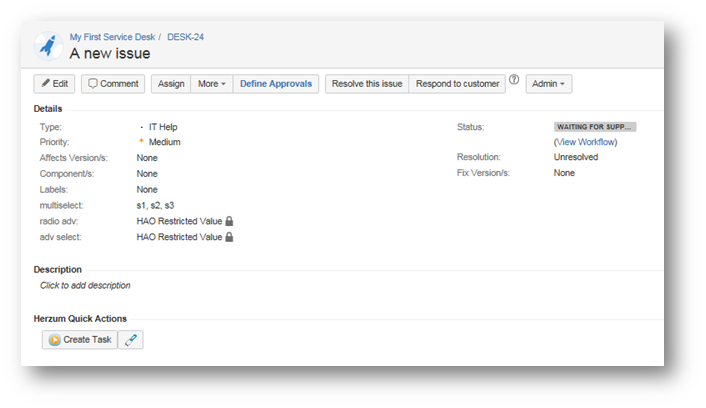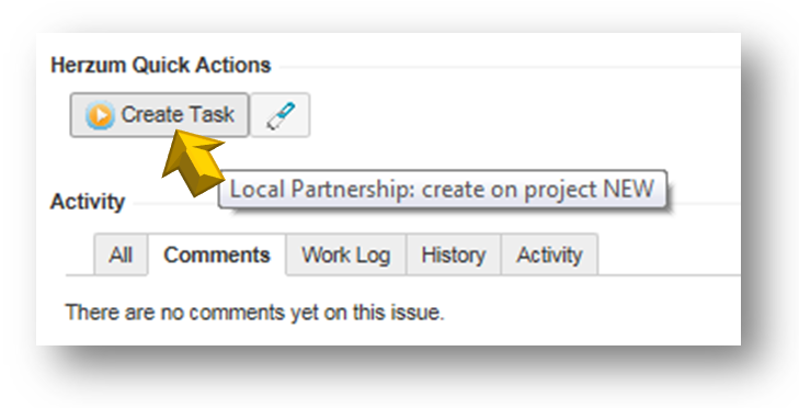 1 Click the Herzum Quick Action button to display the Create Screen of the issue to be created on the Target Jira Instance, Project and having the Target Issue Type.
