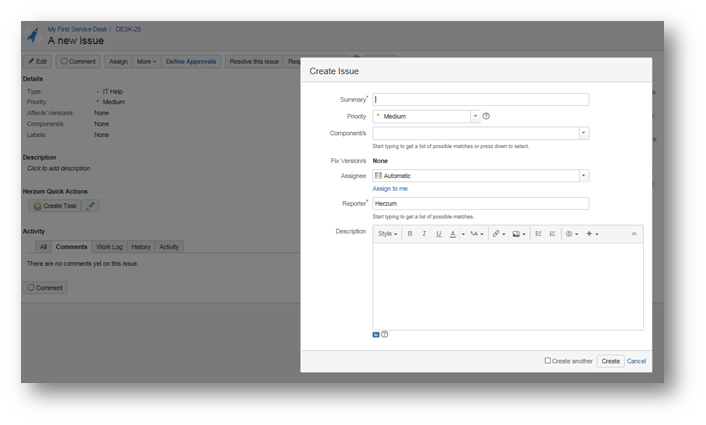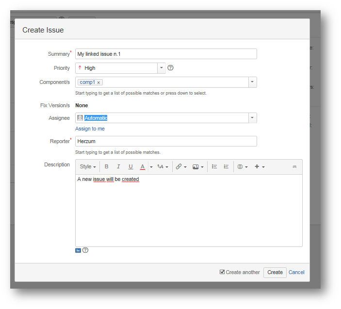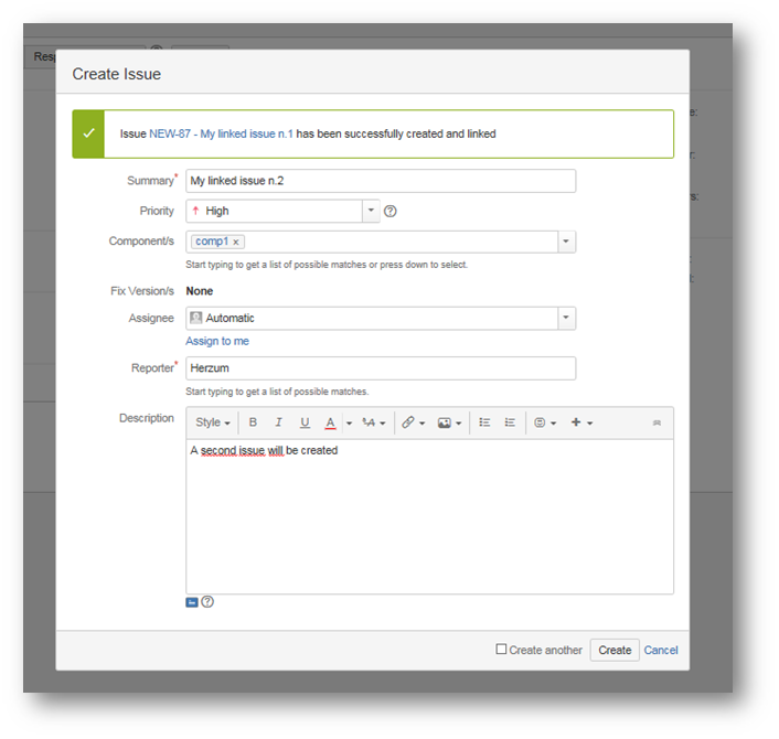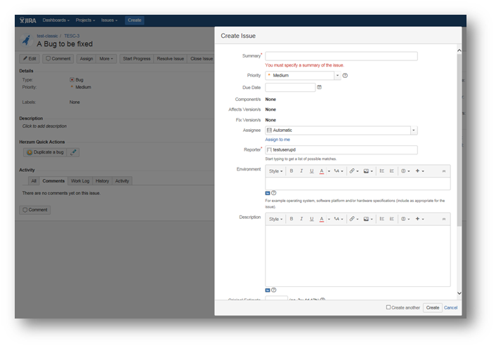 4 | Complete data on the form, check the Create another box to create more then one issue and click Create. | Issue Create screen opened via the Herzum Quick action button |