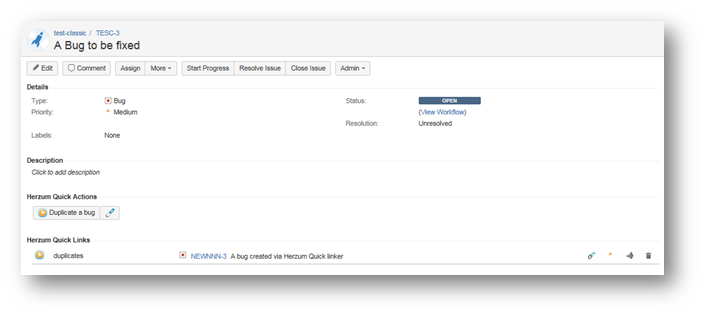 3 | Click the Herzum Quick Action button to display the Create screen of the issue to be created on the Target Project and having the Target Issue Type. | Issue Create screen opened via the Herzum Quick action button |