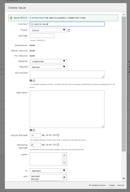 2 If the Create another box was checked the screen allows to insert data to create a new issue. Remote issue create screen