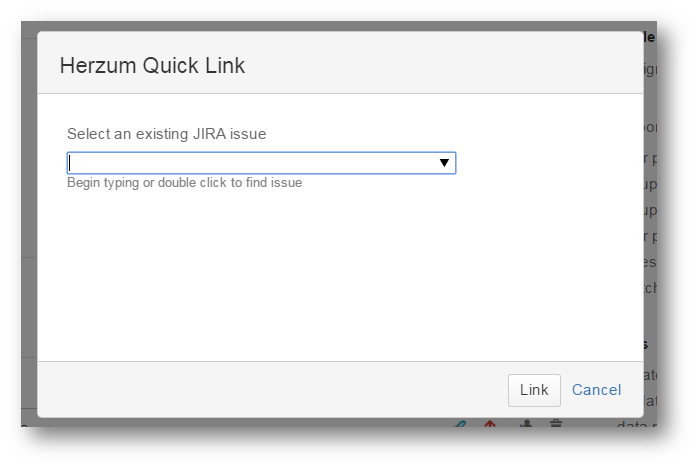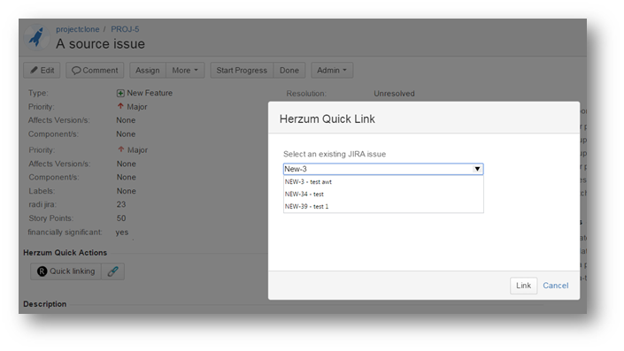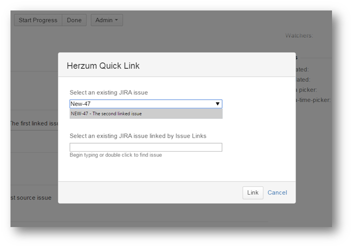 4 | The Select an existing issue select list allows to choose the issue to be linked. Click the arrow on the first select list and click on the issue or just type the issue key. The select list displays only the issues having same Project/Issue type of the Target Project/Issue type set on the mapping. | Herzum Quick Link screen |