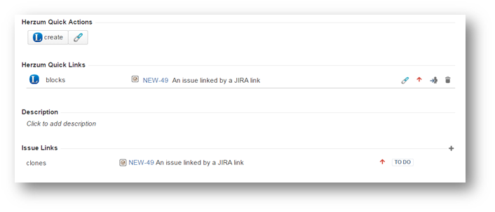 2 | The Select an existing issue select list allows to choose the issue to be linked. Click the arrow on the first select list, click on the issue or just type the issue key and click to link the selected issue. The Select an existing issue linked by Issue Links is not available due to remote issue linking is allowed for Quick link type only. | Herzum Quick Link screen |