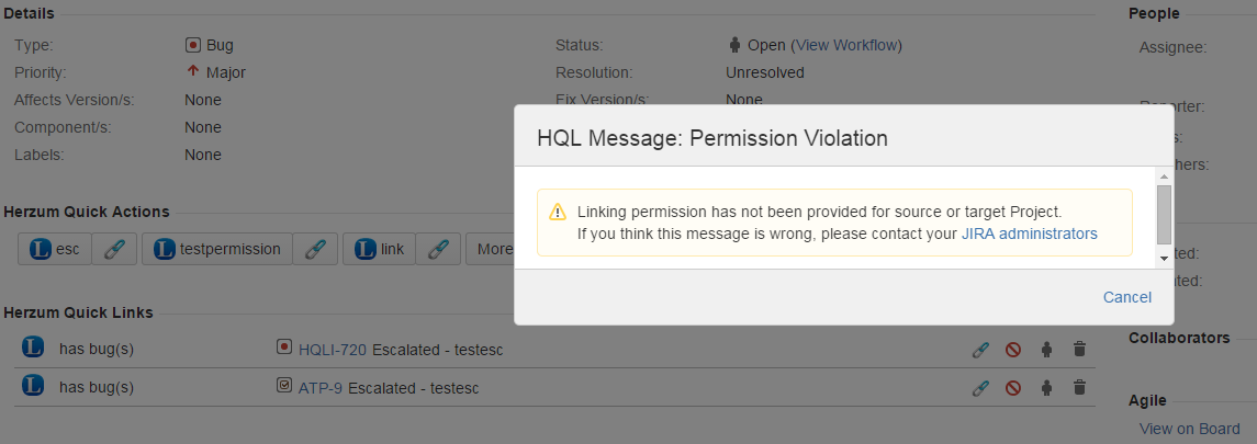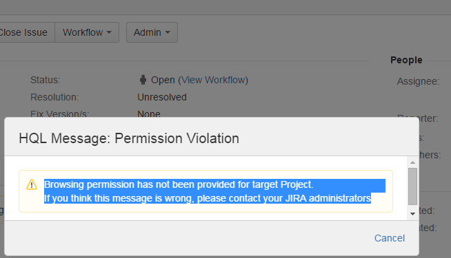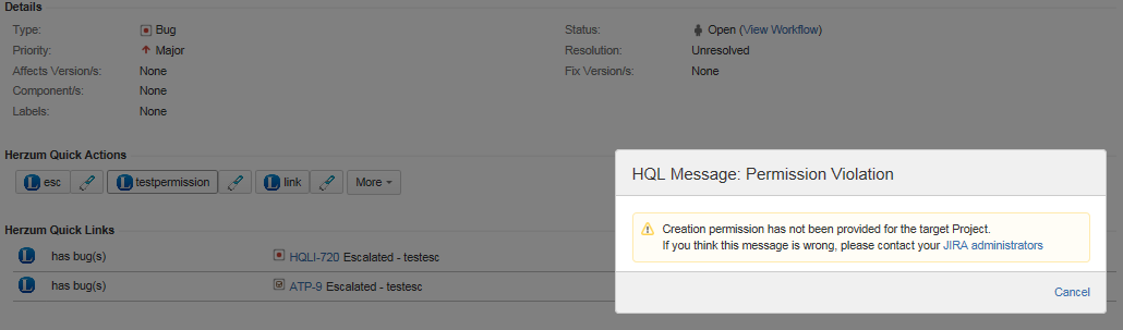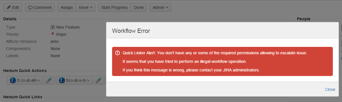 If you encounter this alert it's due the target issue isn't editable (e.g. issue status is 'Closed').
