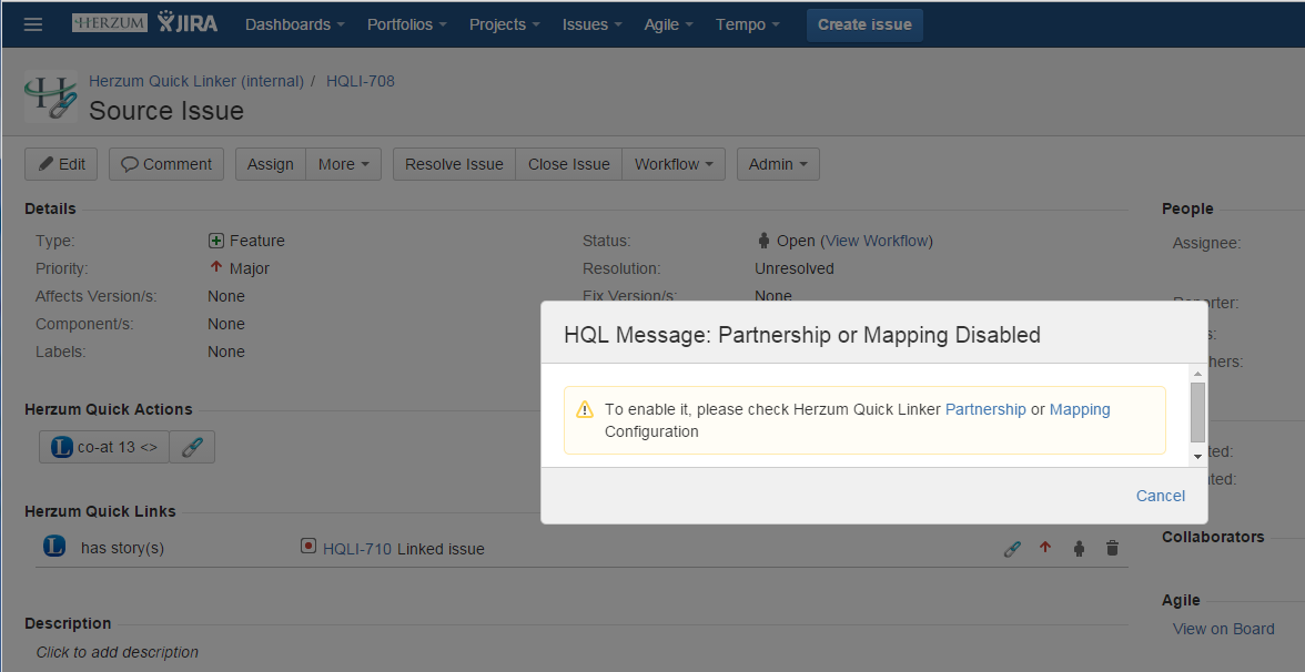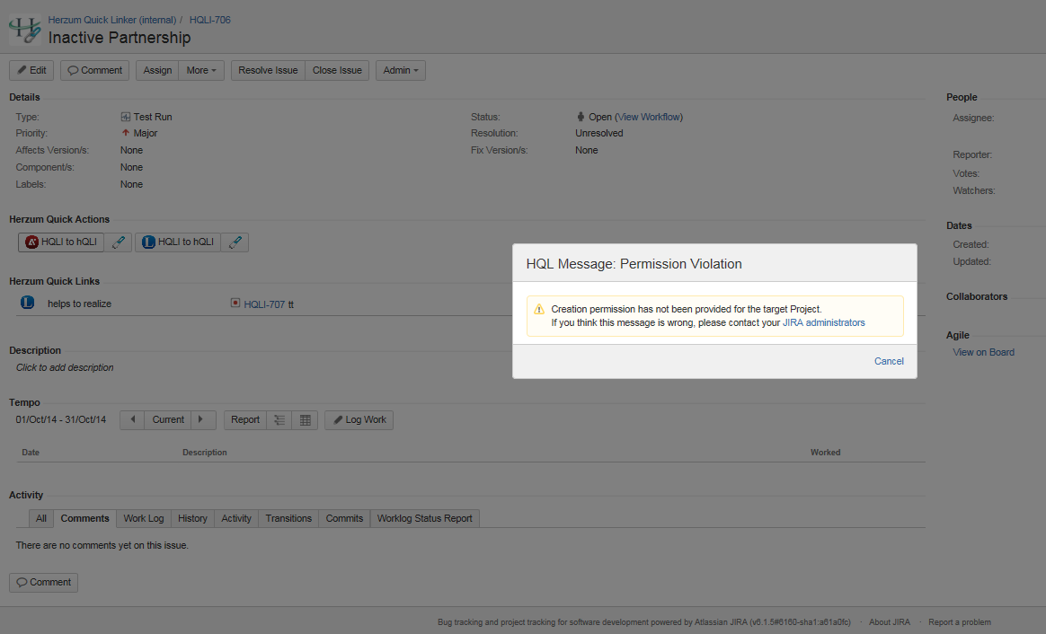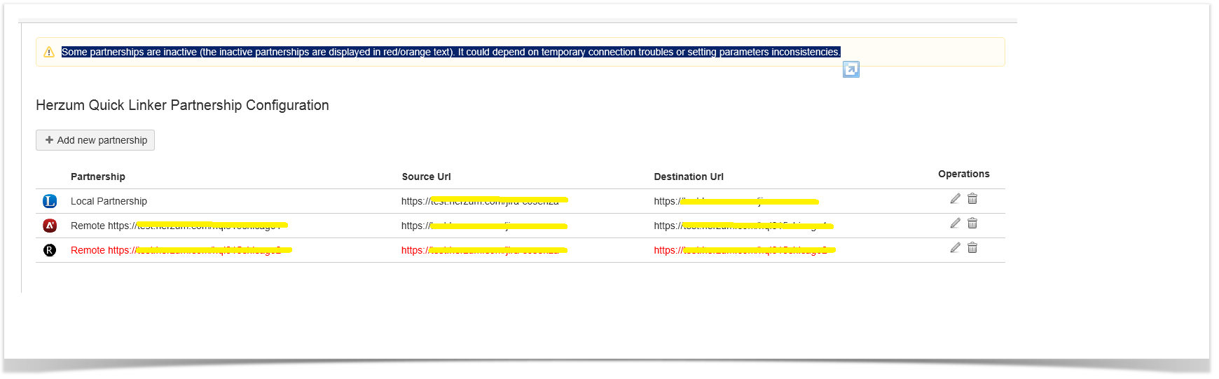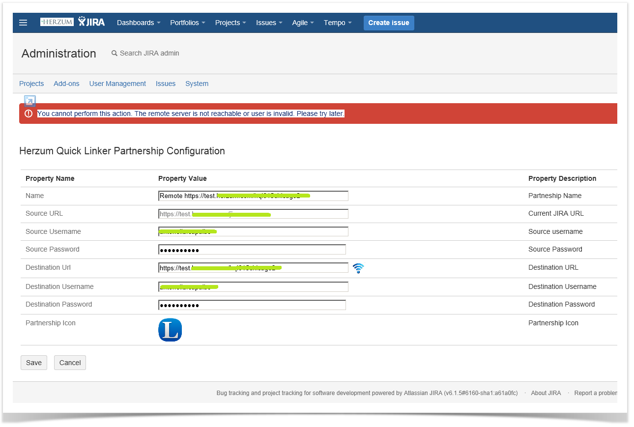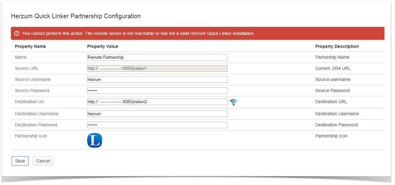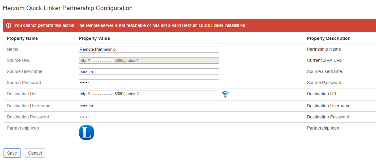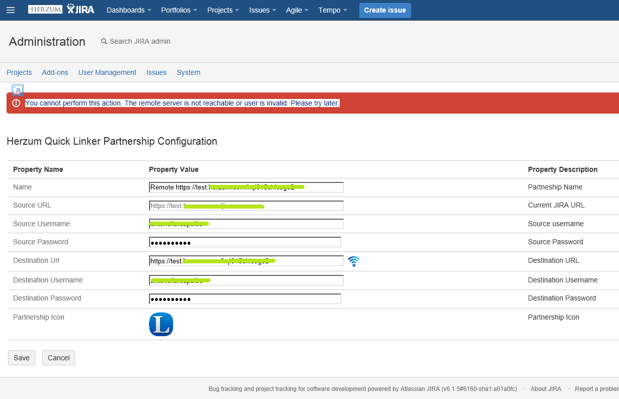 - the Herzum Quick Linker installed on the JIRA instance that is configured destination URL on the partnership is not valid. It can be caused by one of the followings: