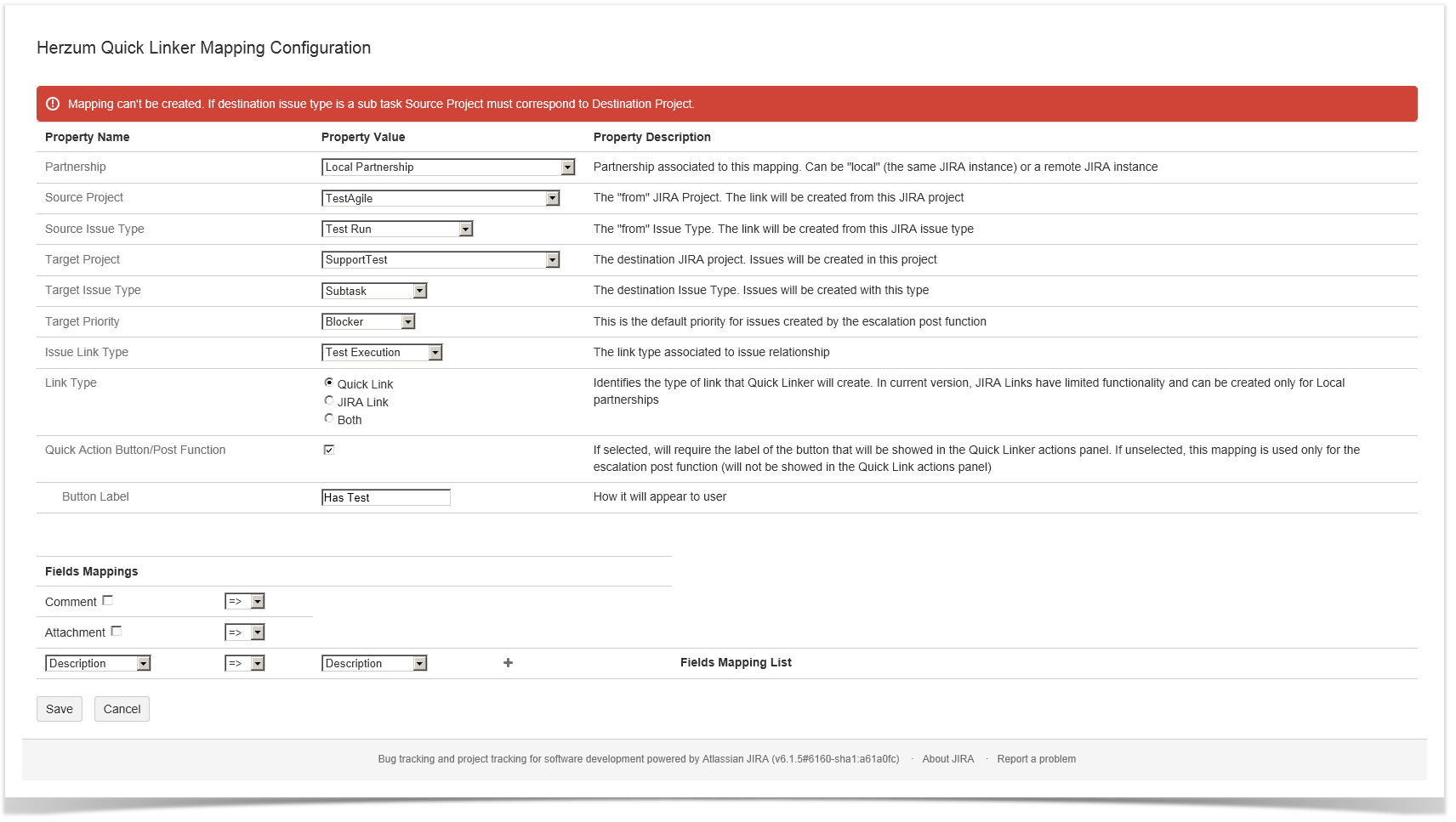 - the inactive mapping is turned in orange: you cannot edit it; the configured mapping can be activated only via the Herzum Quick Linker Mapping Configuration screen of the remote JIRA instance joining the partnership.