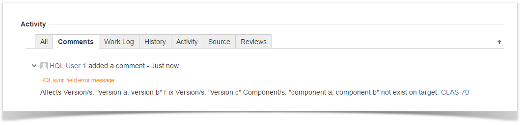 When editing the Affects/Fix Version/s, Component/s, Assignee, Reporter or Priority on the issue Edit Screen, a new Comment is added on the Source and on the Target Issue as reported bellow: