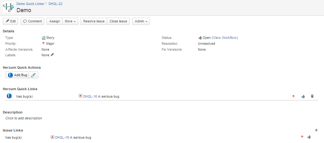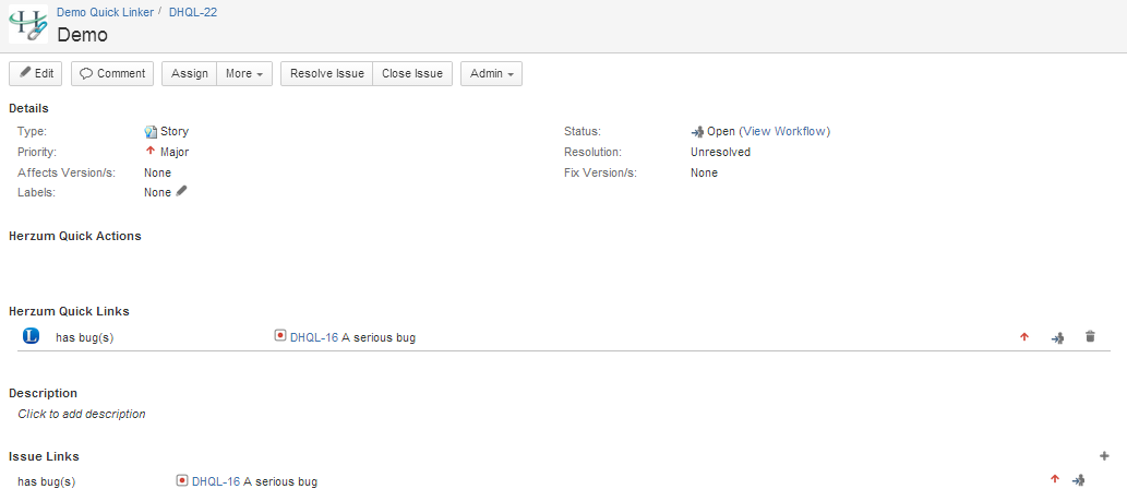 Go to a Project/Issue Type issue instance that has been setup to use a Quick Linker configuration.If the option Quick Linker Creation is activated, the issue link is managed via button(s) available in the Herzum Quick Actions panel.