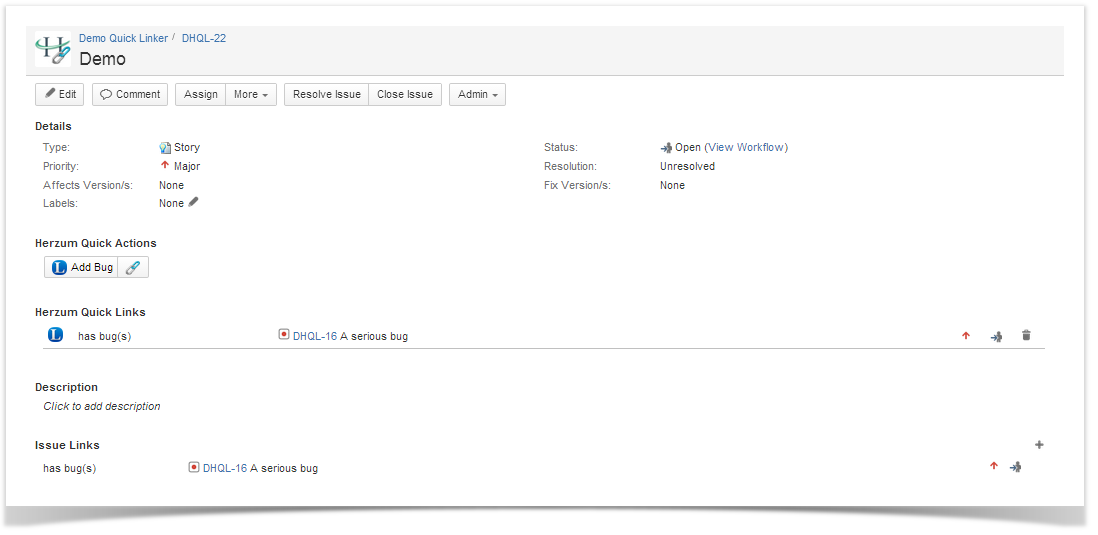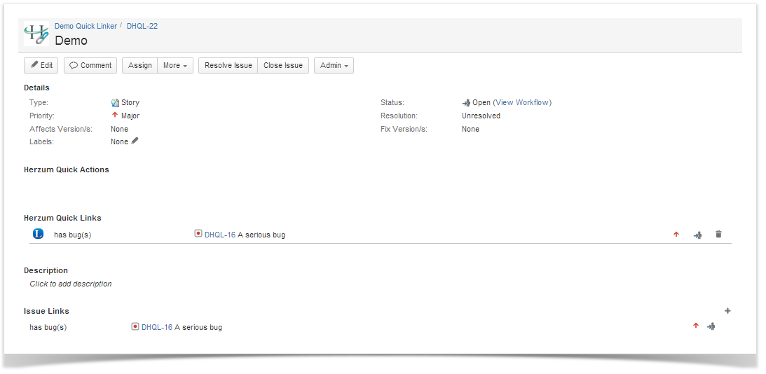 Go to a Project/Issue Type issue instance that has been setup to use a Quick Linker configuration.If the option Quick Linker Creation is activated, the issue link is managed via button(s) available in the Herzum Quick Actions panel.