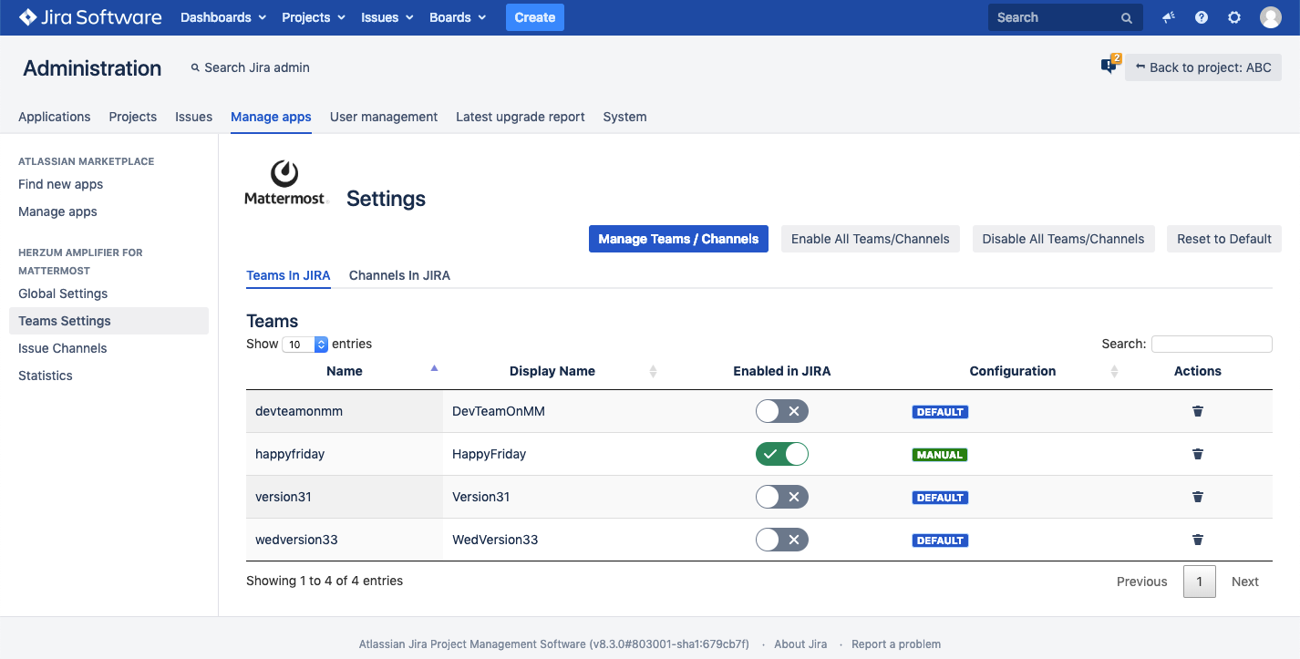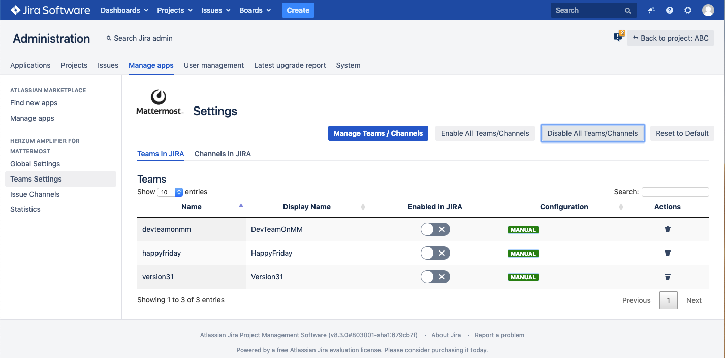 To delete a team from JIRA click am you wish to delete. in the Actions column for the teDeleting a team in Herzum Amplifier for Mattermost Team Settings will remove the team completely from JIRA. The next Mattermost synchronization run will re-import the team. | |