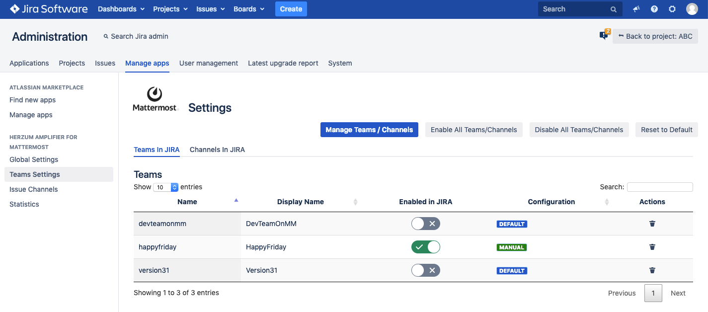 The first tab displays your Mattermost Teams in JIRA. These are the available teams that can be used in your JIRA projects. From the Mattermost synchronizer the teams are created in JIRA with a "Default Configuration". Click to Disable a team. Click to Enable a team.Once enabled the Configuration is marked as "Manuel Configuration." Only when the configuration is changed to "Manuel" will the team's channels be available to use as an issue channel inside a Jira issue. Disabling a team in Herzum Amplifier for Mattermost Team Settings will remove the team from any project settings where the team was enabled. Any project channels related to the team are no longer valid for projects. | |