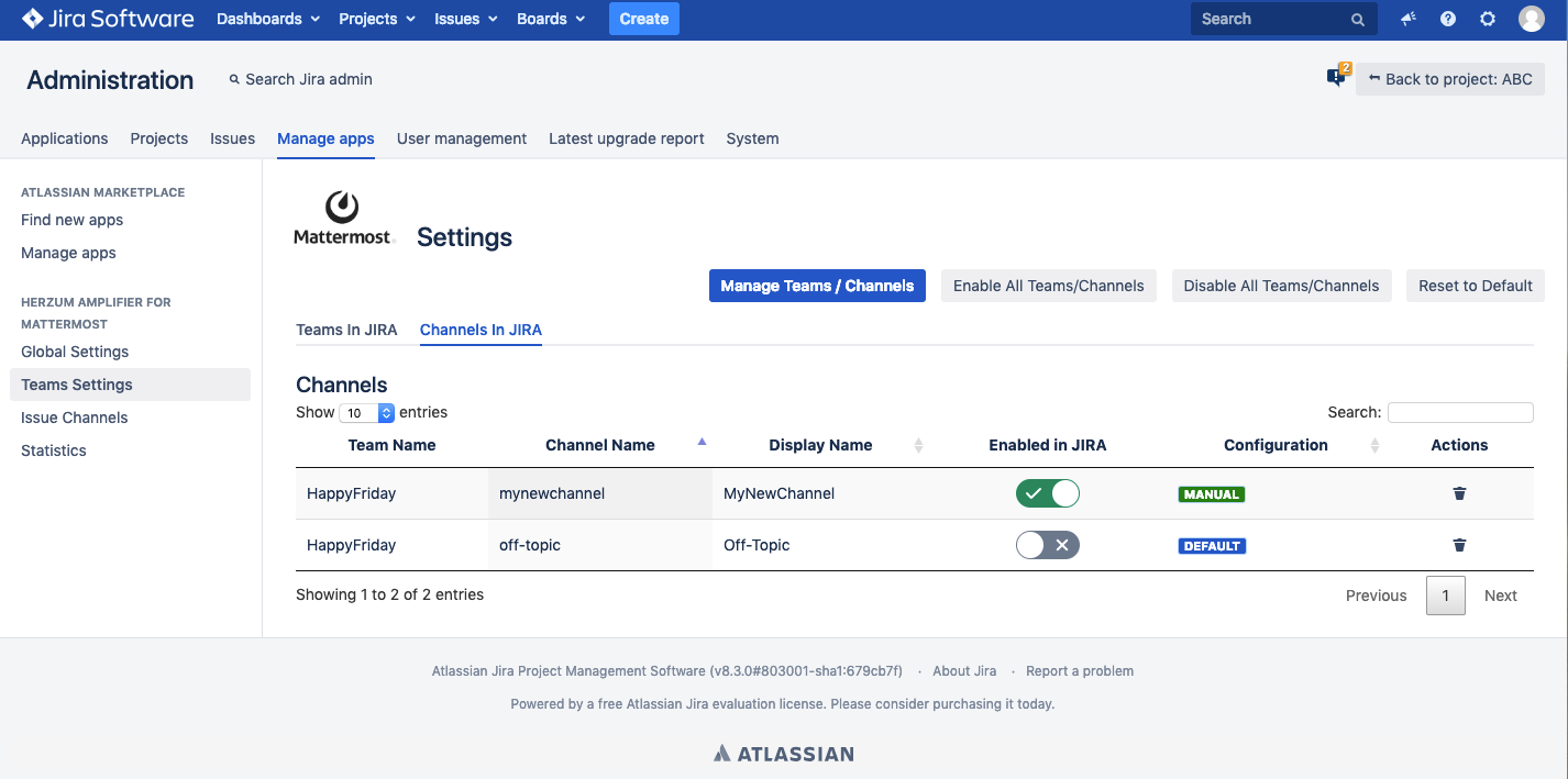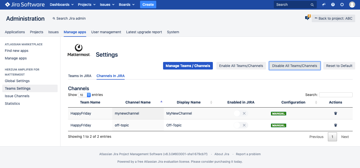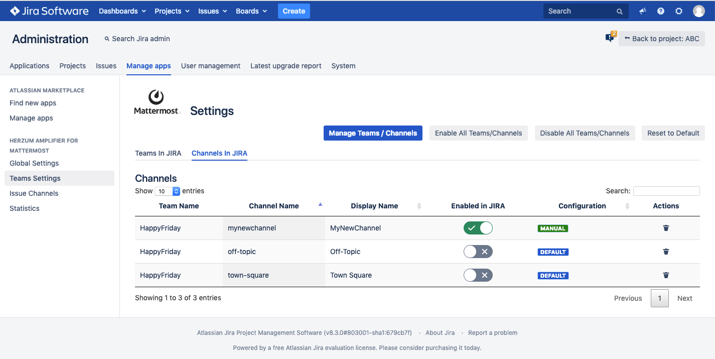 The second tab displays your Mattermost Channels available for use in JIRA. From the Mattermost synchronizer the channels are created in JIRA with a "Default Configuration". Click to Disable a channel. Click to Enable a channel.Once enabled the Configuration is marked as "Manuel Configuration." Disabling a channel in Herzum Amplifier for Mattermost Team Settings will invalidate the channel for use in projects. |