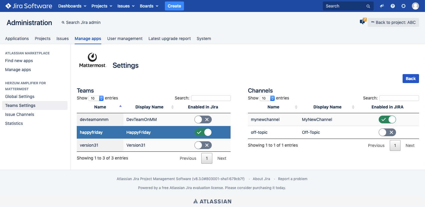 Click .Here you can see all teams available for use in your JIRA instance. Click to Enable a team.Click to Disable a a team. Click on a team name in the list to display all channels belonging to the team. Here you can enable or disable a team's channels. Click to Enable a channel.Click to Disable a channel. |