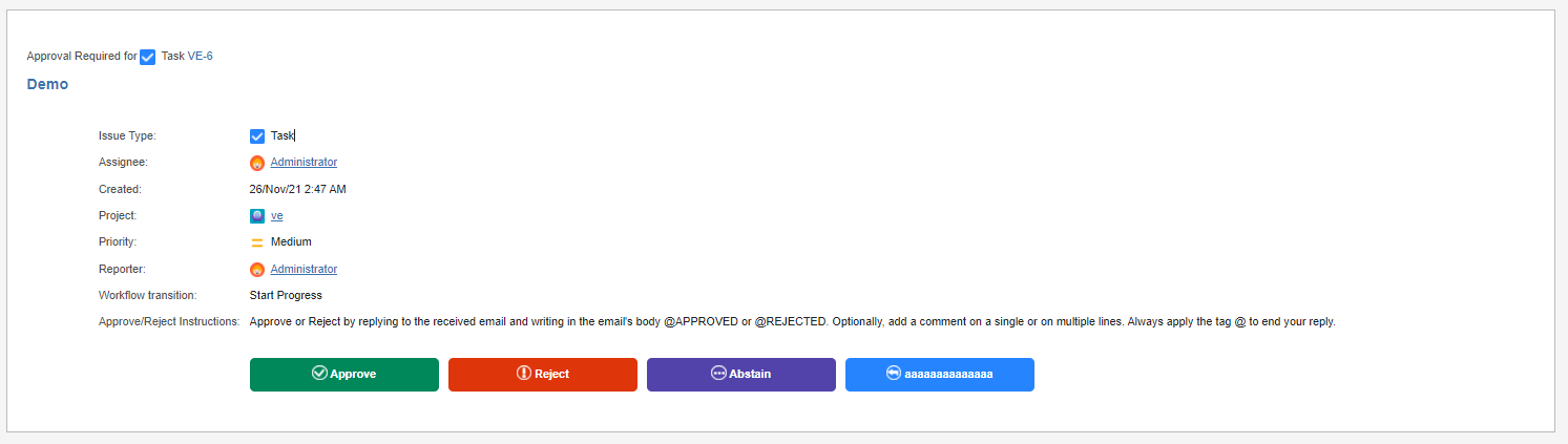 When no customization is applied, the email's buttons have the default labels Approve, Reject, Abstain, Reset.