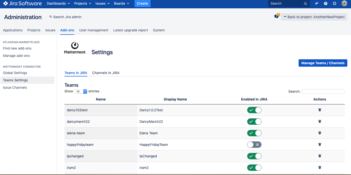 Click .Here you can see all teams available for use in your Bitbucket instance. When a team is created in Mattermost it will show first here on this page as disabled. Click to Enable a team.Click to Disable a a team. Click on a team name in the list to display all channels belonging to the team. Here you can enable or disable a team's channels in Bitbucket. Click to Enable a channel.Click to Disable a channel. |