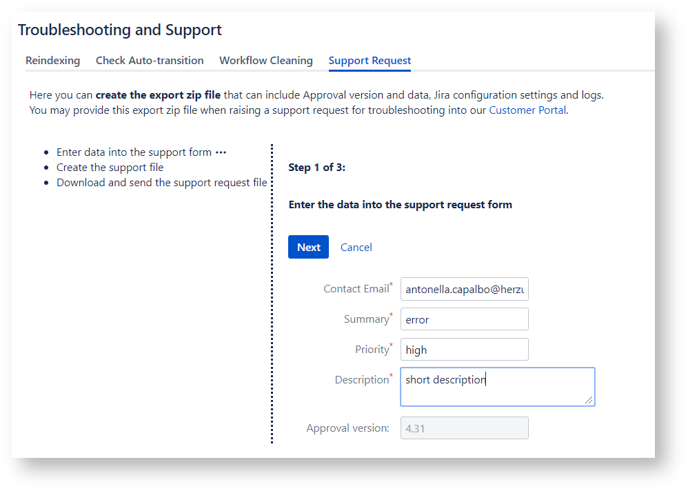 Before to reproduce the bug, enable com.herzumlog.approval.performance package Debug logs in order to collect more detailed information on the error: