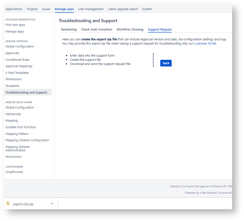 Accomplish the steps described below in order to generate the export.zip file that will allow us to investigate an issue with Herzum Approval app:
