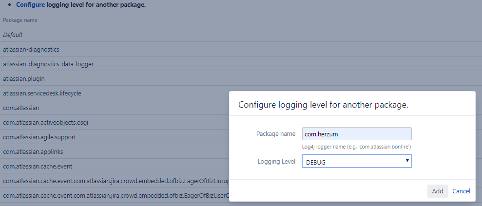 - Edit package name 'com.herzum' and select logging level 'Debug'; click Add