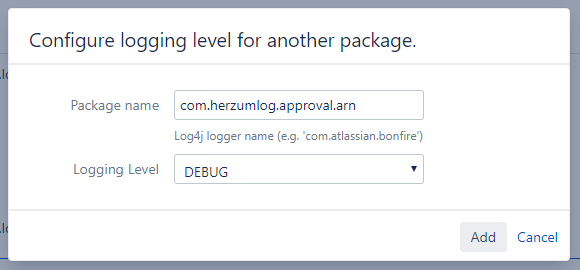- Edit package name 'com.herzumlog.approval.arn' and select logging level 'Debug'; click Add