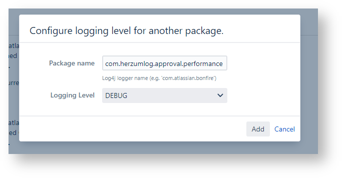 - Edit package name 'com.herzumlog.approval.performance' , select logging level 'Debug'and click Add
